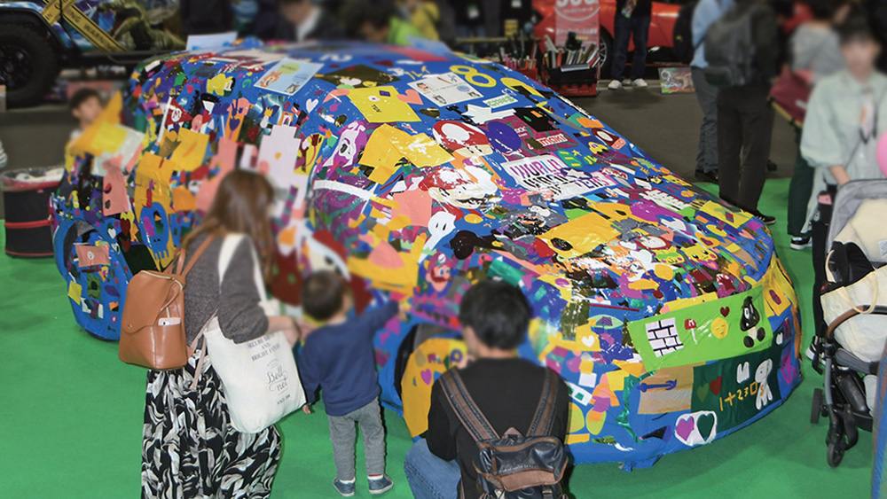 特殊フィルムでカラーチェンジを図るカーラッピング。インパクト抜群の実車展示のほか、体験コーナーではフィルムの端材で車両を自由にデコレーションできます。